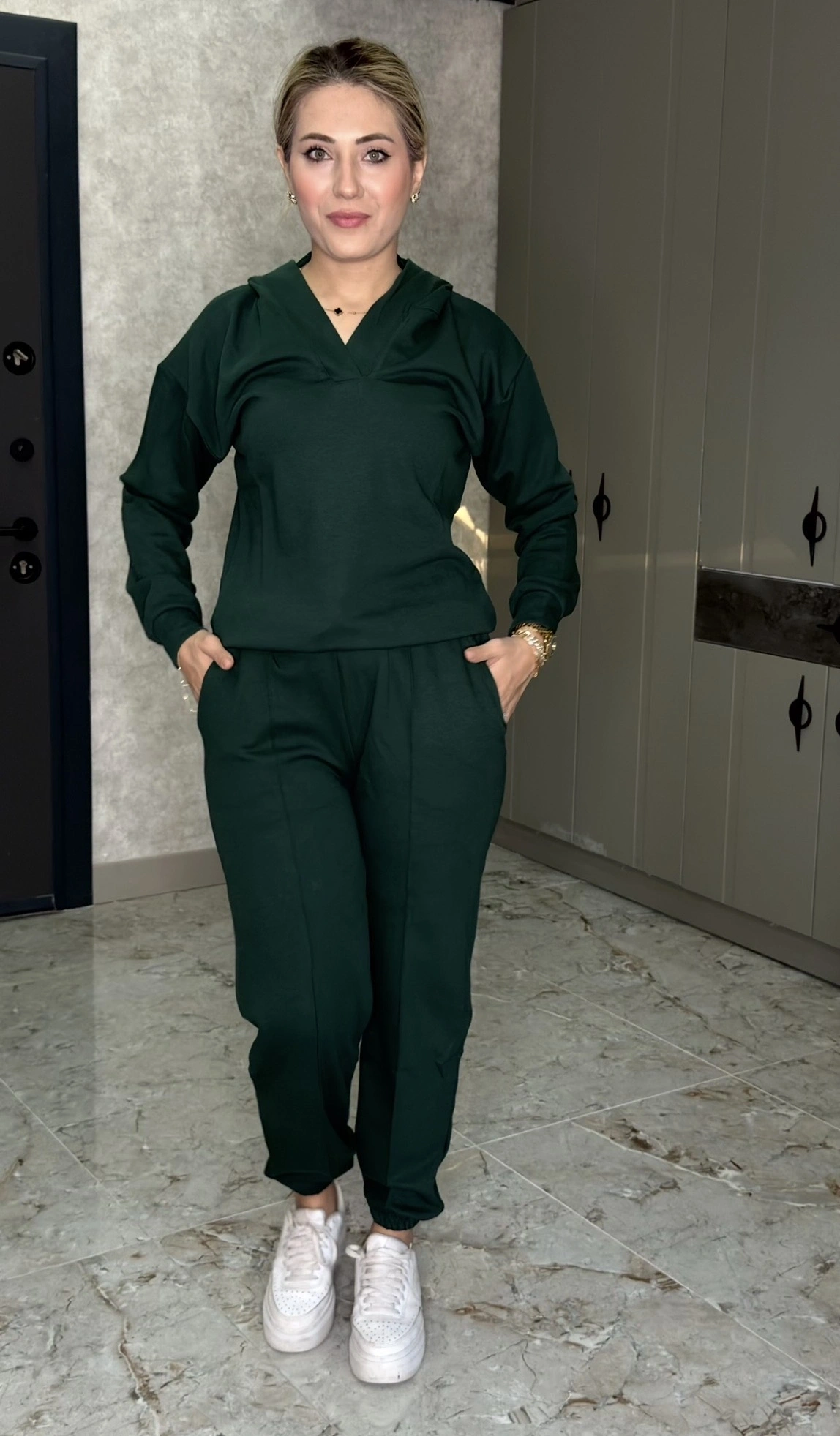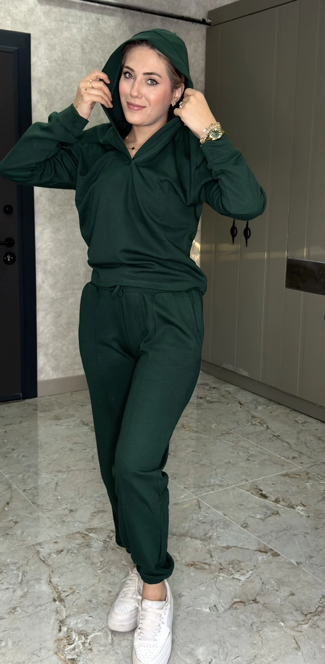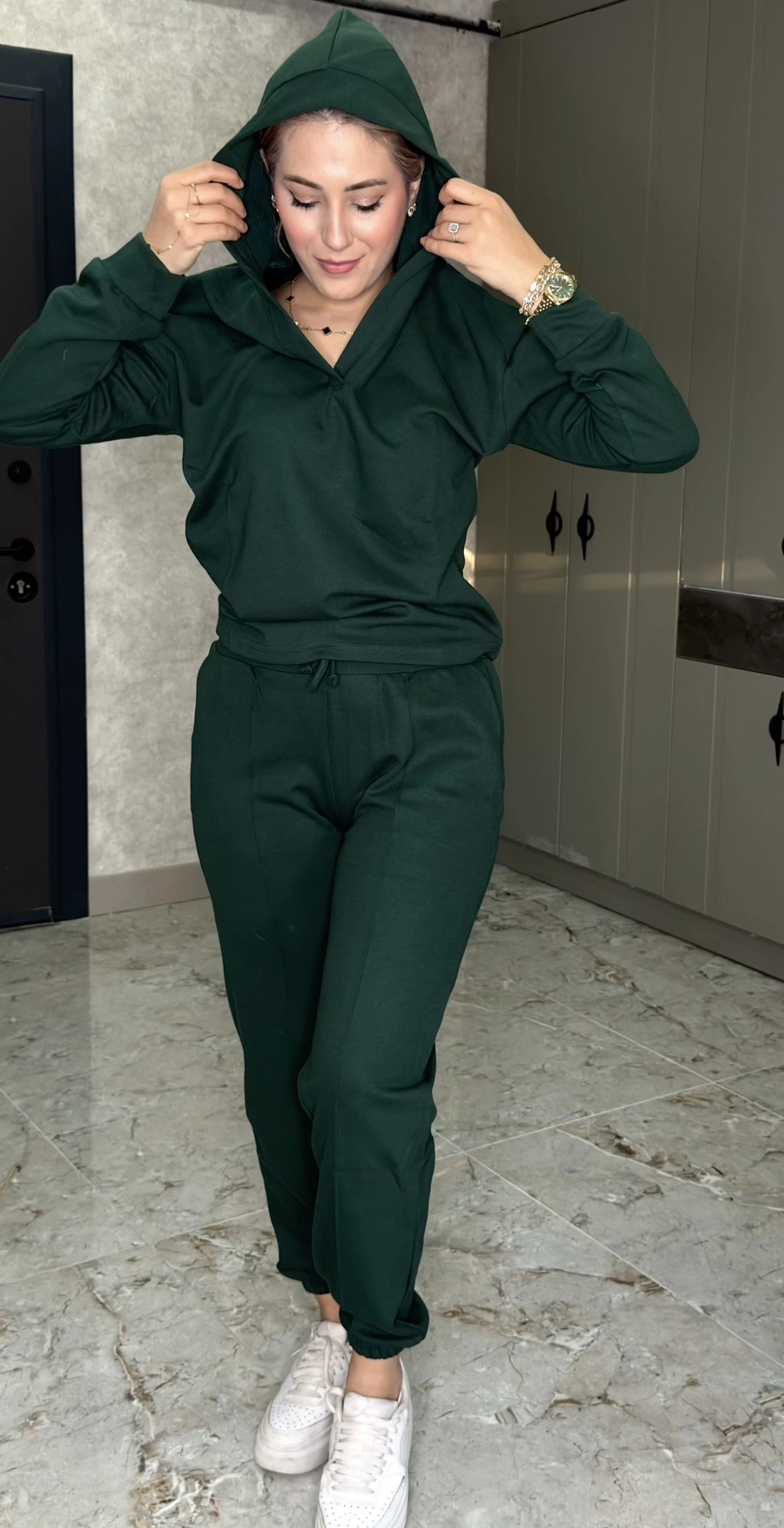 NEFTİYEŞİLİ KAPŞONLU DÜZ TAKIM